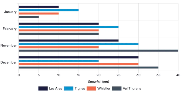 11월과 12월 휘슬러에 내린 눈의 양 확인(11월 = 20cm & 12월 = 30cm)
