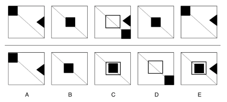 솔루션 : 사각형은 왼쪽 상단에서 가운데로 이동한 다음 각 회전마다 오른쪽 하단으로 이동합니다. 음영 처리되지 않은 사각형은 세 번째 턴마다 나타납니다. 번갈아 회전할 때마다 삼각형이 나타납니다.